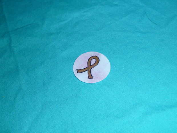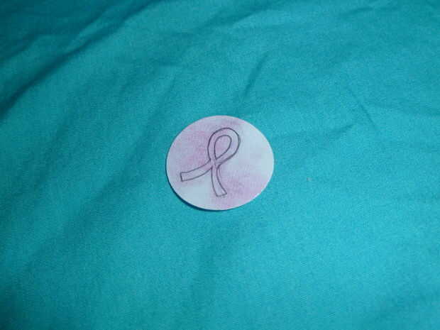 Dibujar algo simple en su círculo. Para este tutorial lo hice una cinta rosa del cáncer pero puede hacer cualquier diseño simple que te gusta. Contornear el diseño con el lápiz negro y dejar reposar unos minutos. Esto es así el Mod Podge lo no manchar en el paso siguiente.