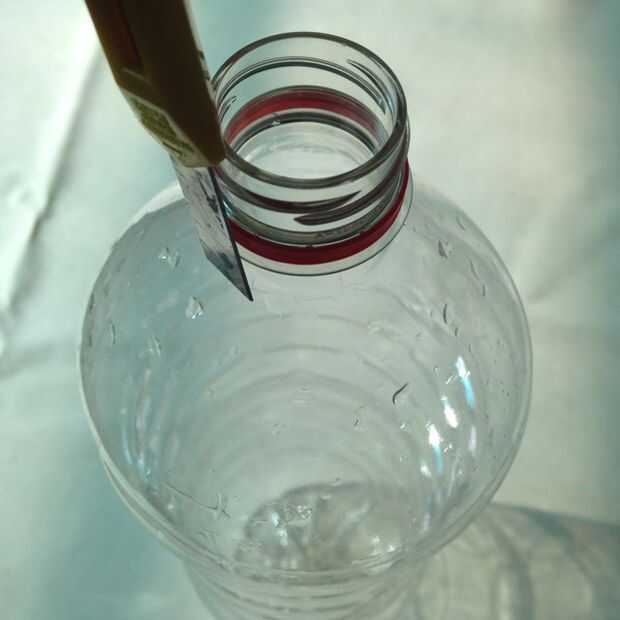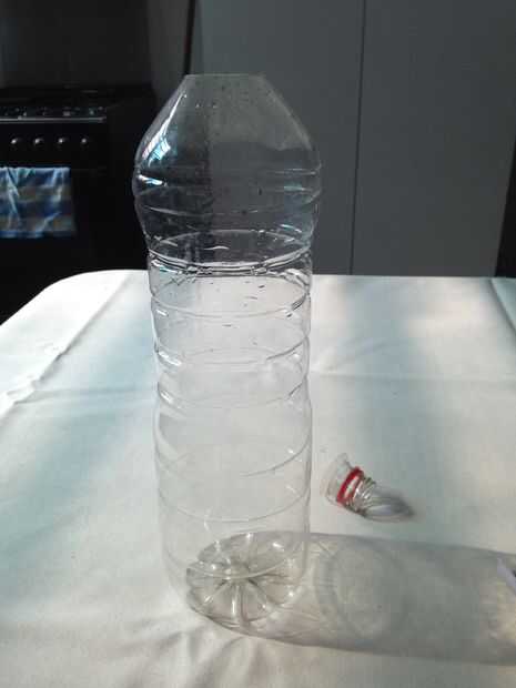 Cortar la parte superior de la botella de la botella grande, para que la parte superior de la botella pequeña cabe en.
