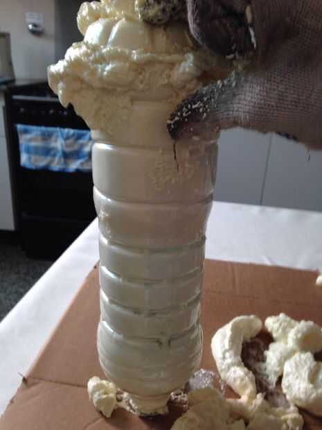 Después de montar la botella pequeña dentro de la botella grande, rellenar los laterales con espuma de poliuretano. Espere unos segundos para que la espuma completamente ampliar y ejecutar luego la presión en la cubierta inferior. El exceso saldrá por el orificio que hicimos en los pasos anteriores.