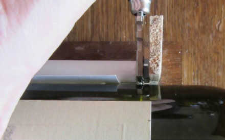 Comience ajustando la herramienta de corte. Puse tarjeta de visita entre la botella y la plataforma y mueve el cortador hasta que simplemente toca la botella y lo apretó. Luego quita la tarjeta y girar la botella una vuelta completa presionando contra el cortador. No gire más de 1 vuelta completa. Cuadros 2 y 3 del corte, éste fue bastante bueno pero un poco demasiado profundo.