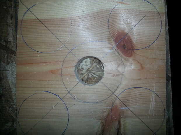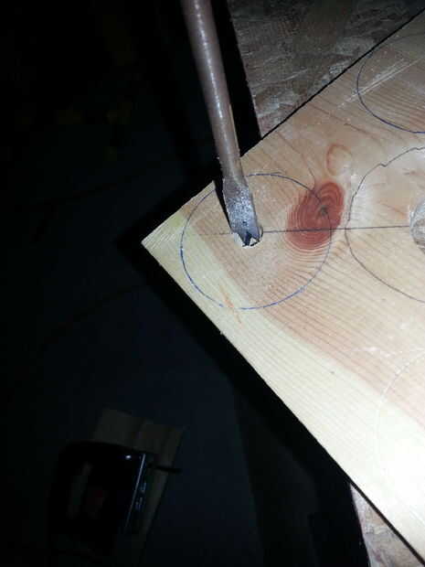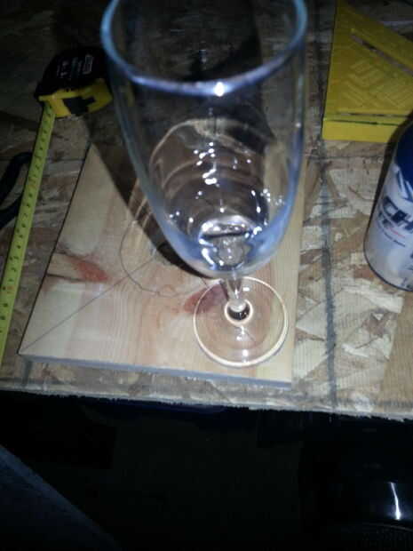 Corté mi stand en forma cuadrada para hacer incluso por todos los lados. Esto hace que cuando todos los vasos en ellos se sientan incluso. Para obtener el tamaño tomé mi botella y vidrios y hacer una plantilla. Puse la botella en la madera por lo que sería en el centro. Luego dibujé un círculo alrededor de la botella en la madera. Luego establecer las copas de vino en la madera y había medido una cantidad uniforme para cada vaso alrededor del círculo de la botella. Las gafas van a estar en cada esquina. Asegúrese de que las gafas son espaciadas uniformemente desde los bordes y la botella. El tamaño de mi stand es una 7 pulgadas por 7 pulgadas cuadrado. Asegúrese de marcar donde está el centro de las copas de vino. Aquí es donde vas a cortar. Marcó el agujero central y entonces perforado una media pulgada círculo lanzó donde está el centro de las gafas. También tomé un 1 y lanzaron broca de media pulgada y corte el agujero por donde pasará el cuello de botella de vino. Entonces la última cosa que necesita hacer es las ranuras para las copas de vino para deslizarse a la madera. Ya tienes medio en el orificio por donde el centro de la Copa de vino es comienzo allí. Dibujó líneas paralelas 1/2 pulgada aparte desde el agujero en la esquina del stand. habrá un cuarto de pulgada en cada lado de las esquinas van al hoyo. Corte la media pulgada con una sierra de calar para que las copas del lado en puntos correcta allí.