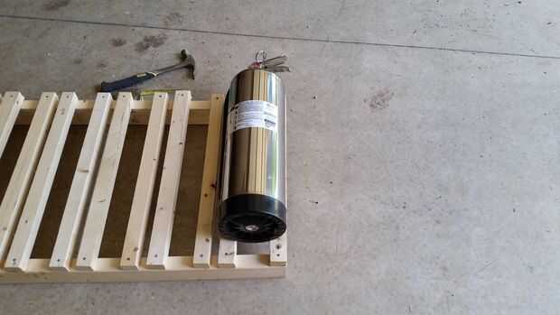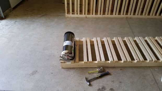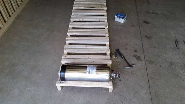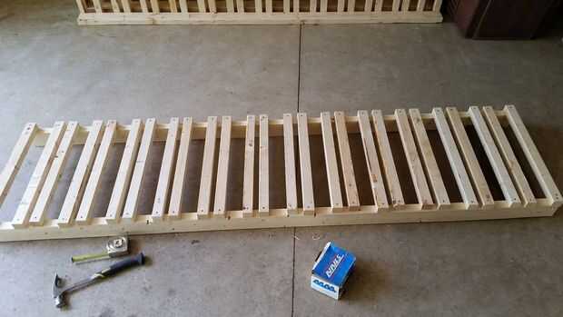 Usando el 2 x 2 x 24" piezas empiezan en un extremo de la repisa enmarcada por clavado en un travesaño usando clavos 8P. Luego medir 3inches y establecer a otro miembro. Mide 1 pulgada y establecer a otro miembro. Alterno cada otro miembro de espacio así que es una brecha de 3 pulgadas entonces hueco de 1 pulgada (fotos 4-8). Esta red de puntos de 12-15 por estante para el almacenamiento de cilindros dependiendo de Cruz tamaño de miembro. (2 x 2 vs 1.5x1.5).