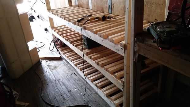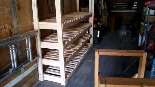 Después de crear las capas del estante Fije los estantes a la 2 x 4 x 10' columnas con la 16P clavos o tornillos de drywall de 2.5-3 pulgadas. Asegúrese de que cada estante es nivel y debidamente espaciada adelante hacia atrás. Puede un ángulo los estantes detrás unos grados si hay una preocupación de los cilindros de resbalamiento.