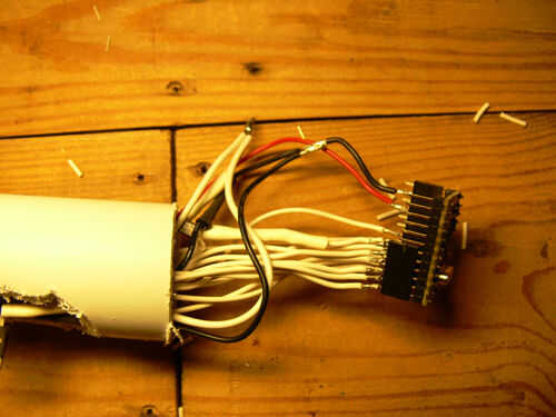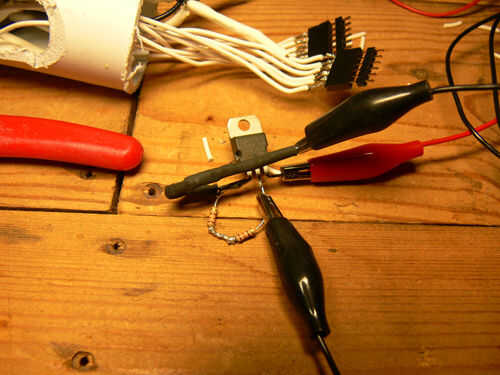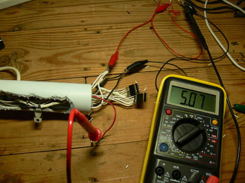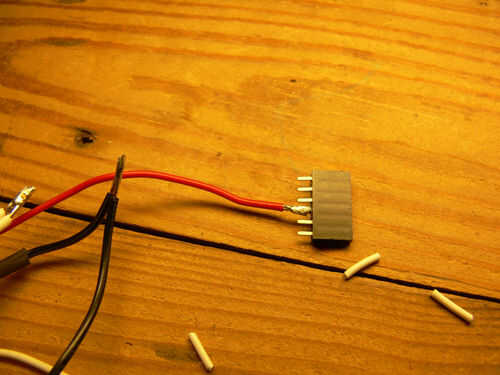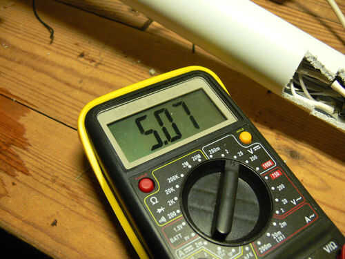 Una vez que he encontrado los valores correctos para conseguirlo ceñir hacia fuera de 5v de Arduino, que la soldadura, termoencogibles y pruebo. 5.07v que sale, no está mal. Ahora sé que funciona, yo puedo soldar en el paquete principal de cableado, toma 12v, va a la tierra, y tener una tercera salida irá a arduino. Empiezo otro zócalo de la cabecera, poner la línea de 5v en él correspondiente al pin de 5v de arduino. También conecto tierra de arduino en el mismo socket también.