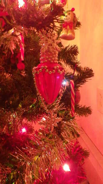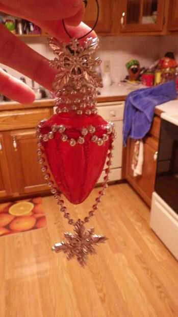 comencé con pintura roja. Otra vez, sólo una capa. A continuación, cortar tiras de 5 bolitas y había hecho un diseño que arqueado en la parte superior. Si usted quiere que usted puede medir el espacio, sólo fue para él y funcionó hacia fuera. Después de eso, yo pegado a un soporte en cada lado y adjunta una nieve escamas por lo que le cuelga por debajo de la bombilla (la pequeñas bolas y copos de nieve son parte de una guirnalda que encontré hace años en una tienda de artesanía, lamentablemente estoy casi fuera), envuelve la parte superior donde el olor sale en bolitas y pegado un copo de nieve se volvió a su lado en la parte superior. Último, agrega brillo a la parte superior de las curvas y hace líneas salen las chuletas y se encuentran en la parte inferior (aplicar 3 capas de brillo para obtener una buena acumulación de dejarlo secar debajo de un ventilador pequeño entre cada capa). No te olvides de envolver una percha de alambre floral alrededor de la tapa en algún lugar, siempre trato de ocultar en el diseño.