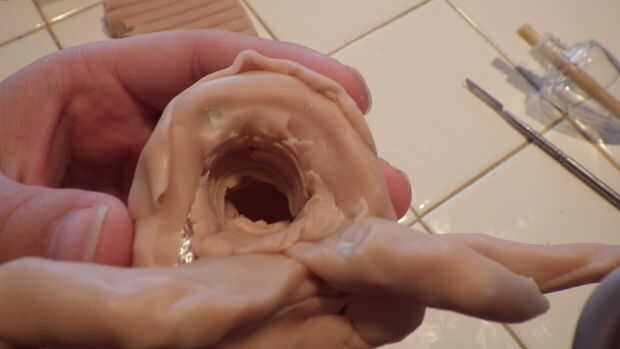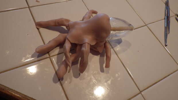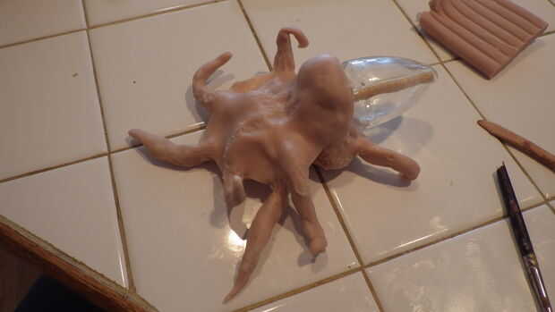 usé una limpiada hacia fuera del tarro de salsa de pasta como un rodillo y arcilla aproximadamente una 16 de una pulgada entonces cubierto por la armadura y envuelto alrededor de los tentáculos. Hice una compilación de varias piezas y los mezclan, los bordes pueden ser mezclados con un tipo de espátula, herramienta de esculpir. La arcilla será resistente a agarrar la hoja pero una vez que asoman y prod poco apoderará. Cubra el anillo que sostiene la botella de perfume en arcilla y llene la botella interior entonces el hilo en la arcilla por lo que es la rosca (una vez horneada la botella puede ser roscado y pegado en lugar de agregado estabilidad)