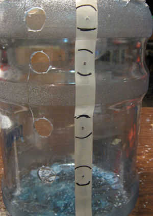 Use 2 botellas al lado para encontrar el espacio necesario para la siguiente fila y pegue la cinta en su lugar. Marque los agujeros y hacer lo mismo todo, asegúrate de comprobar los espacios con las botellas para que tenga lugar para ellos en su lugar. A la broca.