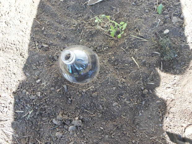 Sacar la botella para el jardín y cavar un agujero amplio, profundo y enterrar la parte inferior 2/3rds de la botella al lado de una planta.