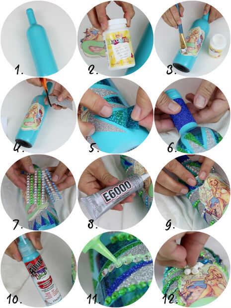 2. y 3. Decoupage la imagen de la sirena a la botella con Decoupage Americana en brillo