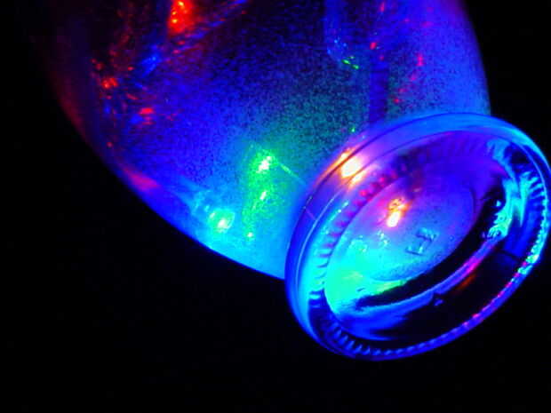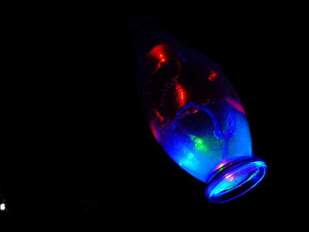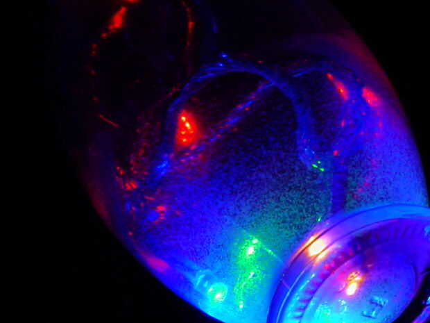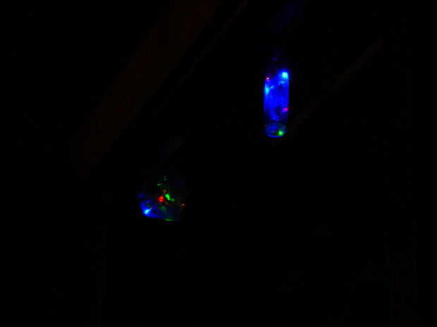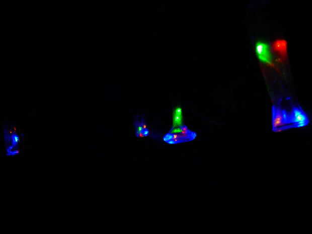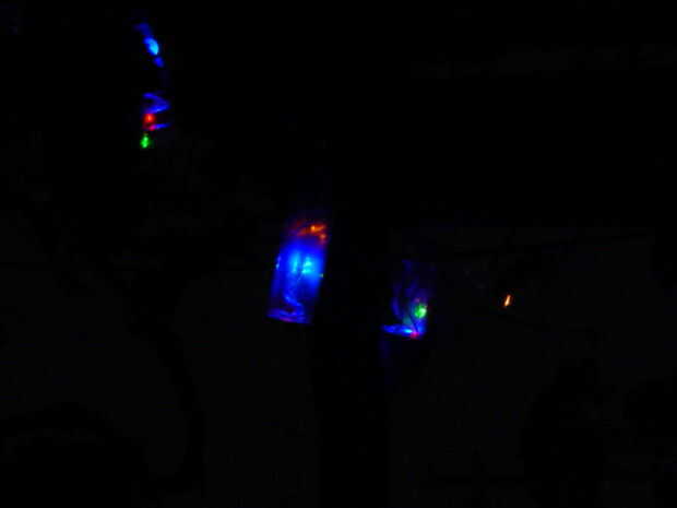 Este es mi segundo uso de un sistema de iluminación solar distribuida, donde el grupo puede sentarse en algún lugar en el sol y envía energía a las luces que se encuentran en un lugar sombreado. Supongo que su clase de un medio paso entre luces solares del jardín y el cableado de su casa para la energía solar. En este caso, el resultado es un solo panel montado en un lugar soleado en una pared que envía energía a una cadena de botellas de vidrio por debajo de un árbol uva.