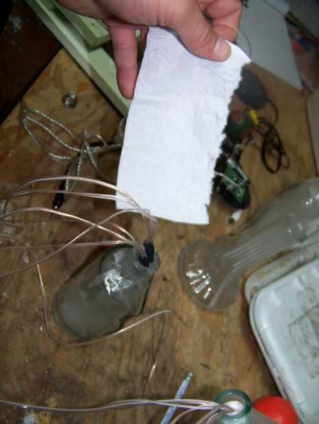 Cosas los LEDs en la botella. Tomar una tira de una toalla de papel, a veces hasta un par de veces y envuélvalo alrededor de los cables por encima de la cinta aislante. Necesita suficiente papel toalla para crear un ajuste entre la toalla de papel y el cuello de botella de interferencia, sosteniendo los cables en su lugar temporalmente.