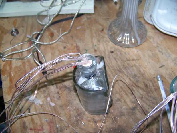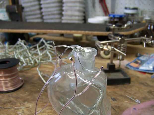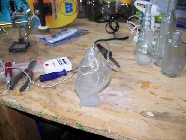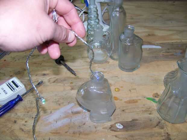 Con sesenta bombillas a instalar en trece botellas, yo no podía sólo dividirlos para arriba igualmente. Lo que terminé haciendo fue poner cuatro en cada pequeña botella, cinco en cada una grandes y seis en la botella grande de la patrona.