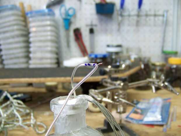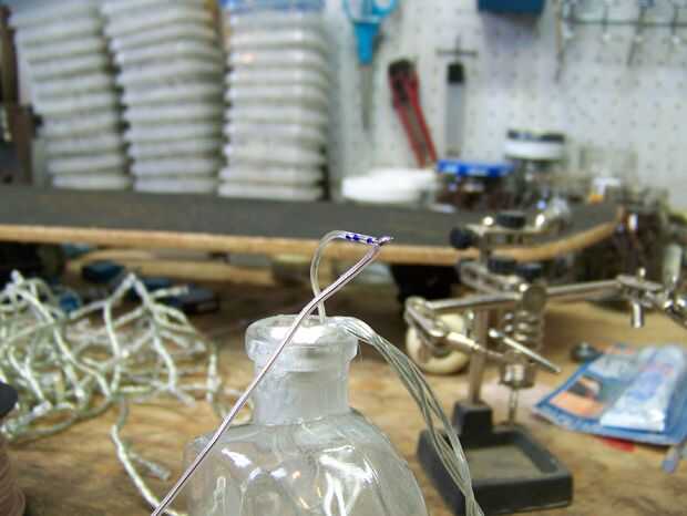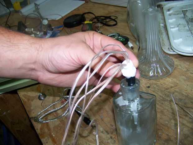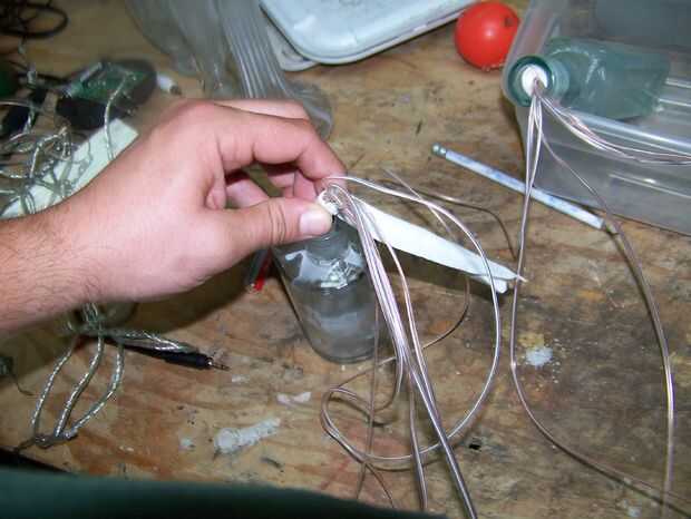 Comience en el extremo de las luces de Navidad más lejos lejos de la batería. Elegir tu primera botella y decidir cuántas luces se van en él. En medio de uno de los cables entre la última luz que va en la botella y el siguiente en línea que no va en, cortarlo por la mitad y tira 1/2" de aislamiento del cable. Con el conjunto de luces que estaba trabajando en cinco hilos entre cada luz, que significa asegurarse de tener por lo menos que muchos largos de altavoz cable práctico, uno de los cuales habrían sido separado en dos cables separados.