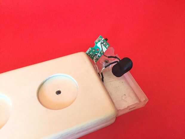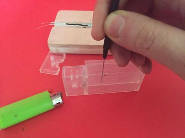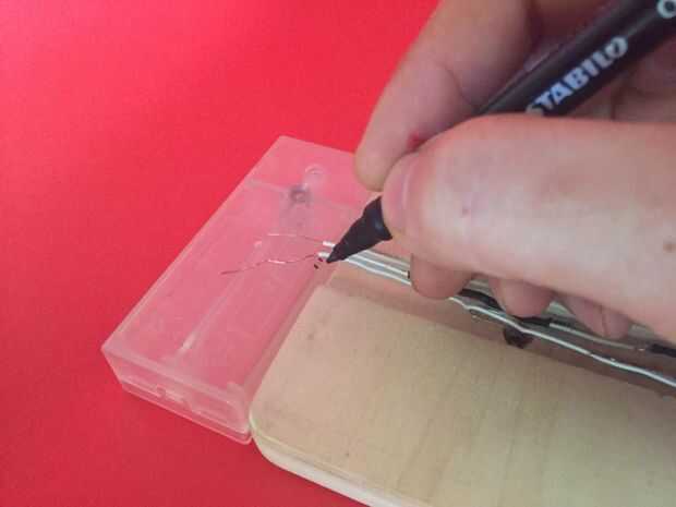 Coloqué a un costado de la base de madera, he marcado y había perforado dos pequeños agujeros para los cables, y finalmente había soldado a interruptor interno.