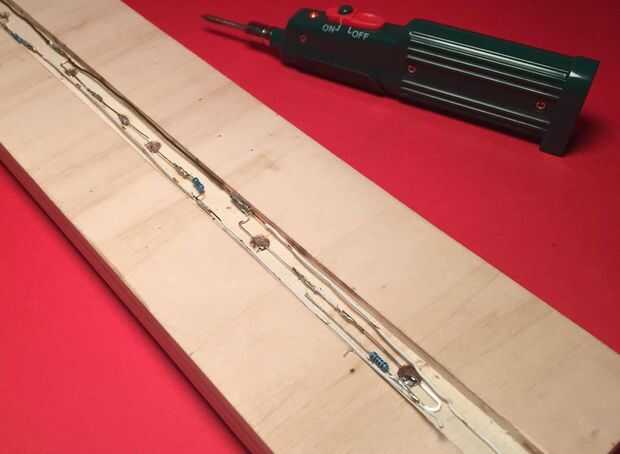 En primer lugar inserté los 6 LEDs en los agujeros, luego que soldar cada par de LEDs a un resistor, y finalmente que conectado al soporte de la batería 2AA.