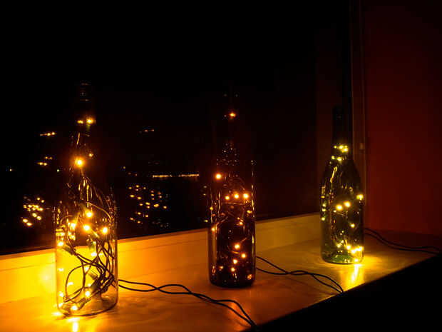 Hay cadenas disponibles en eBay que son con pilas. Puedes ponerlos a través del cuello, tapón de la botella para ocultar un poco el cable y listo! Yo he contemplado modificación de una de estas cadenas para que la batería realmente cabrían dentro de la botella. Sólo alimento para el pensamiento, me avisas si haces algo como eso!