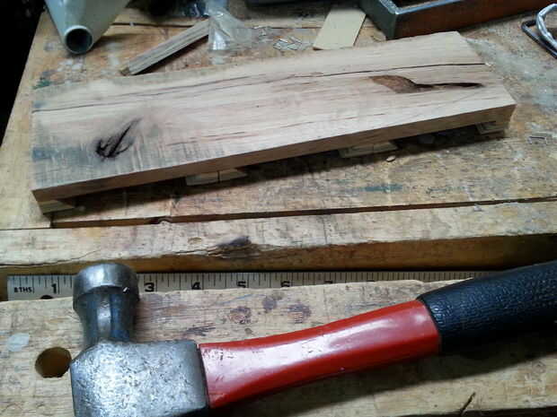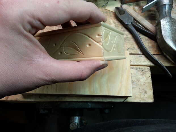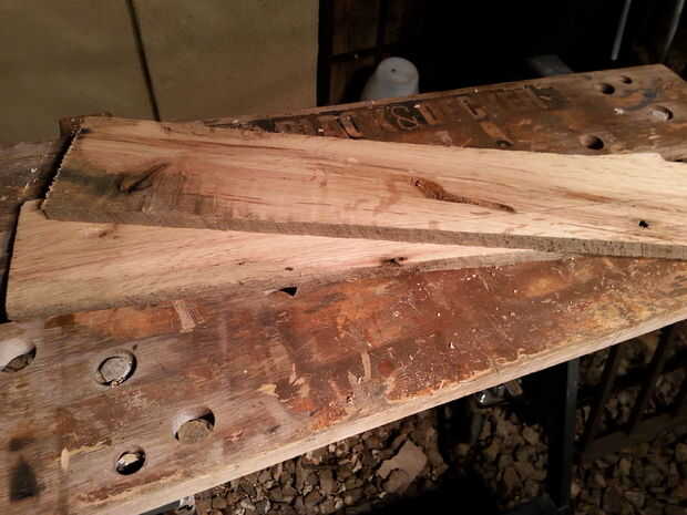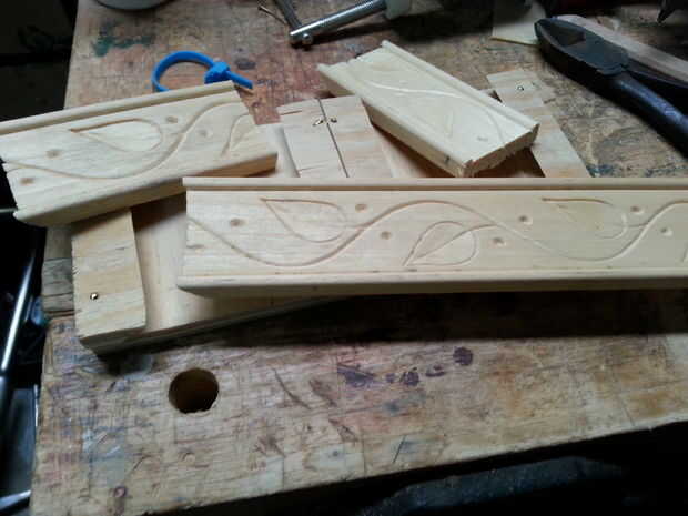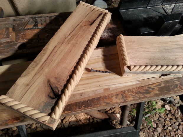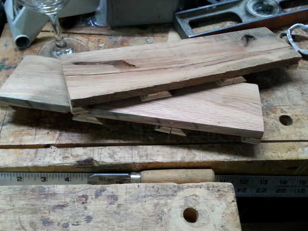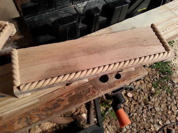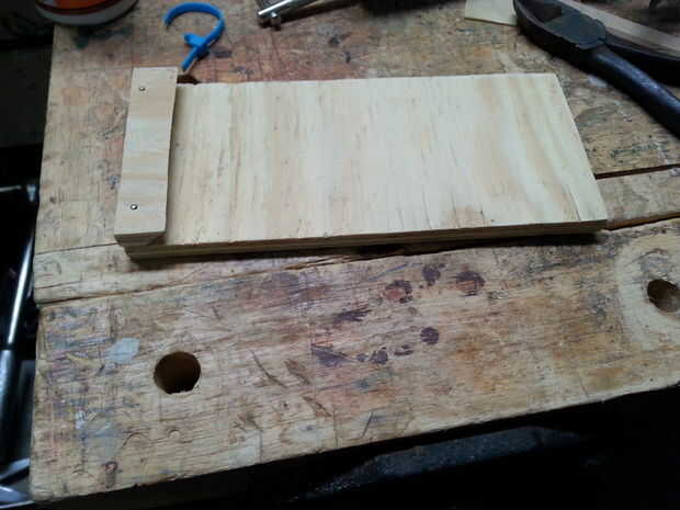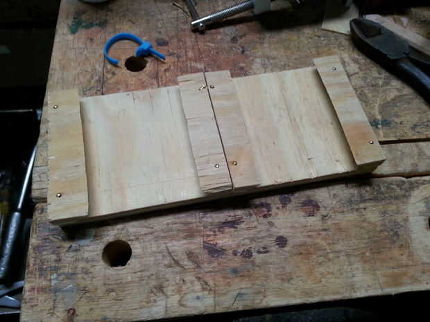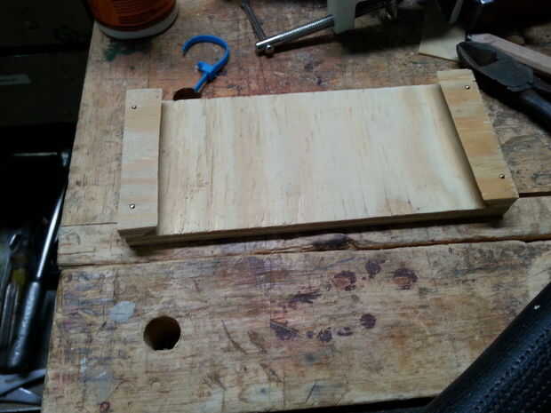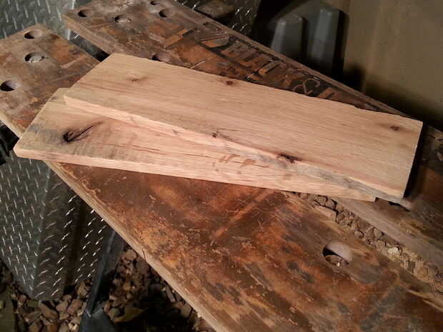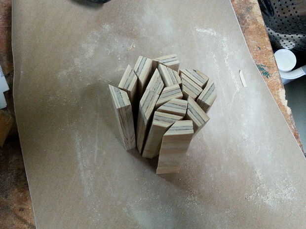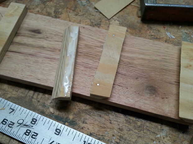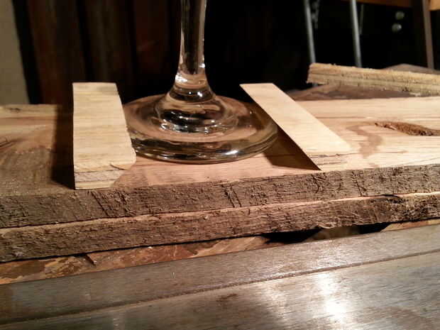 De los estantes más bajos están hechos de las planchas más delgadas de un palet normal. Se cortaron a 3.5" x11.75" y cepillada a. 5" de espesor. Las secciones de madera de la Copa son 3.5" tiras de. 25" madera contrachapada. Las tiras son pequeños trapecios con un lado cortado recto y el otro corte a 45 grados. Es el más grande de los dos lados. 75" de ancho. Ver las fotos de arriba si necesita clarificación. Corte estas tiras es un poco difícil, por lo que recomiendo hacer un pequeño jig o utilizando otros trozos de madera para ayudarle. También puede usar una caja de ingletes para esta parte.