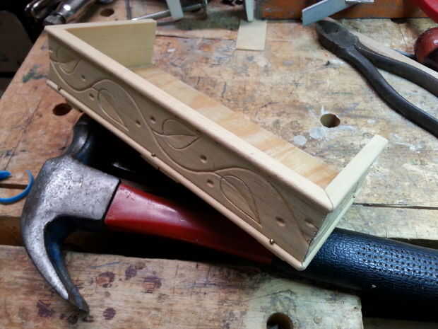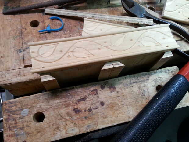La columna del centro se hace de la misma manera con la excepción de una sección de 3,5 "x 8" de madera. Otra vez, con cuidado coloque las tiras de la madera contrachapada asegurándose de que su colocación es tan preciso como sea posible. Para la columna del centro, también encontré algunos gabinete de chatarra recorte y atado ras con la parte inferior de la madera de palet. Puesto que el ajuste tenía un diseño asimétrico, tomó cuidado de cortar las piezas para que se alineen en las esquinas. Esto no es totalmente necesario, pero hace el cableado se vea más agradable más tarde. La moldura se podría substituir con madera contrachapada más si usted no puede encontrar un diseño agradable.