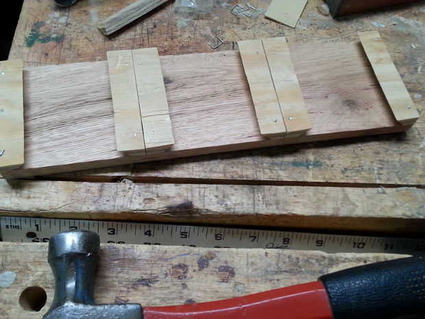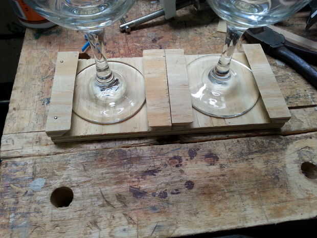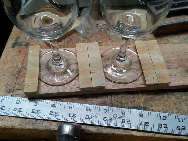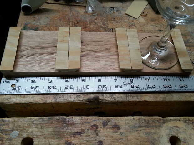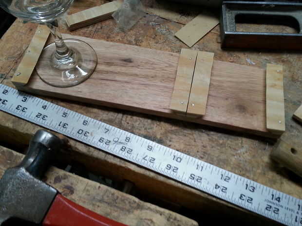 En cuanto a fijar cada tira, aplicar pegamento a lo largo de su longitud y clávelo en la parte inferior de la Junta. Comience con una de las franjas exteriores, cuidadosamente verificando que el espacio tendrá las copas de vino. Con las tiras de contrachapado que corte, los espacios medición 3,9375"(3 pulgadas y 15/16 de pulgada) de un lado de una tira al lado opuesto de su pareja. Desde que corté el estante a las dimensiones finales en primer lugar, empecé con las tiras de exterior antes de pasar a la mitad los para que no quedaría sin habitación. Un enfoque mejor sería cortar el estante un pelo largo y recorte la parte sobrante después de fijar las tiras hacia abajo de su longitud. Si decides seguir mi enfoque, comprobar, comprobar y triple verificación se une el espacio después de cada tira de nuevo. También es de vital importancia que las bandas son paralelas entre sí.