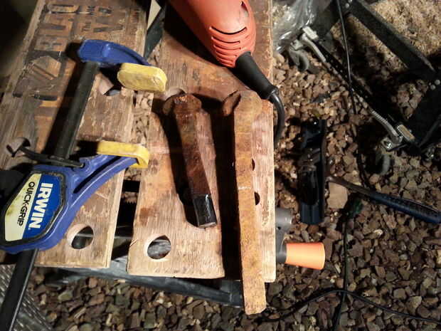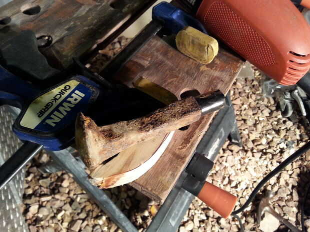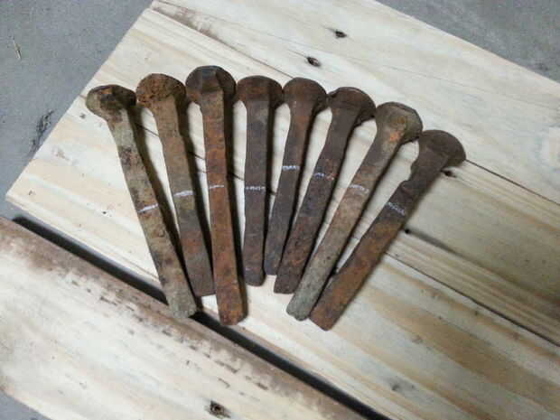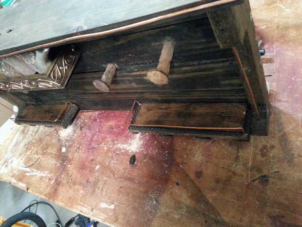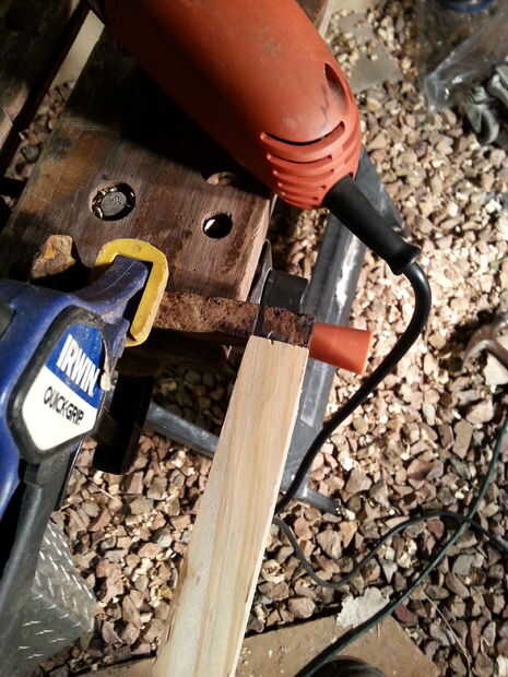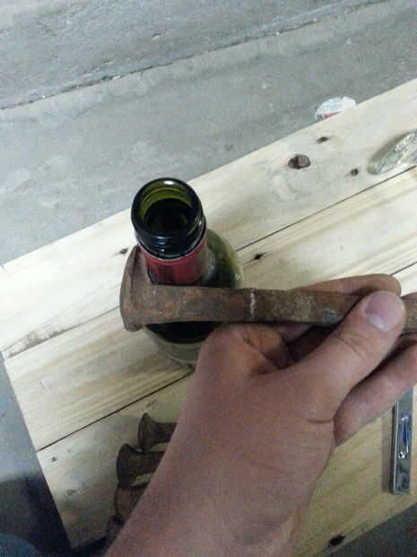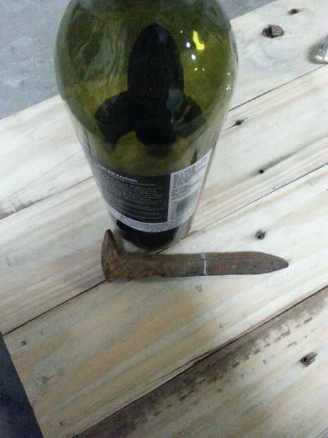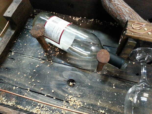 Ahora para los clavos del ferrocarril. Cada copa de vino tendrá dos puntos de apoyo. Una versión más corta apoderará del cuello de la botella mientras que un pico ligeramente más apoderará del cuerpo de la botella. Coloque las puntas contra la botella para ver donde se reunirán el portabotellas. Que la longitud de la marca y añadir el espesor de la pared posterior. Esto le dejará con una sección corta que debe ser redondeado hacia fuera. Recorte el sobrante y completar la base de la espiga, procurando no para mar las partes visibles de la espiga del ferrocarril.