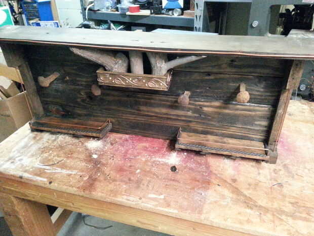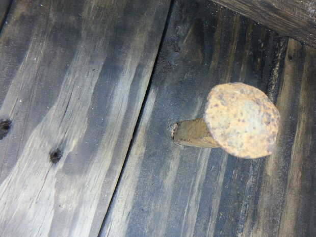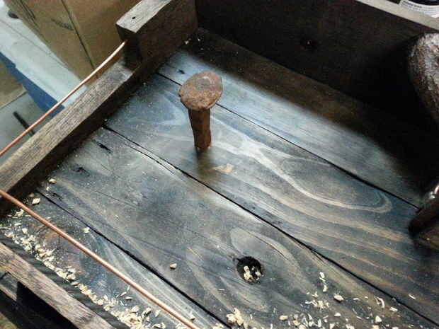 Una vez que las clavijas de su ferrocarril, pruebe la colocación de las clavijas con una botella para ver donde tienes que colocar las puntas. Para mi diseño, el centro de la espiga más larga era 5" desde el tablero superior y 4,25" del tablero de lado, y la espiga más corta era 6,75" desde el tablero superior y 11" de la placa lateral.