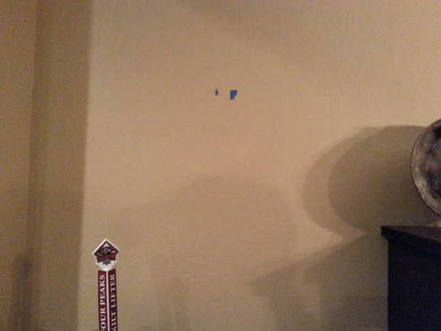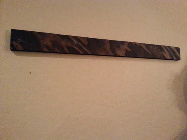 Para realizar la Cala, tomar una tira de 36 "x 3" de. 75" madera contrachapada y cortar por la mitad hacia abajo de su longitud en un ángulo de 45 grados. El corte crea un par que se enclavija, uno va en el estante del vino y la otra en la pared. Una tira larga en la pared le permite distribuir el peso del estante del vino a través de un área más grande y aumenta la probabilidad de pasar a través de una viga en la pared. Si hay no hay clavos donde quieres colgar el estante del vino, definitivamente ver usando los pernos del molly u otros tarugos para asegurar la parte inferior de la Cala del francés. Allí pasó a ser una pared común casi centrada en donde planeaba en colgar el estante del vino, por lo que he podido poner cuatro tornillos de 2,5" en la viga.