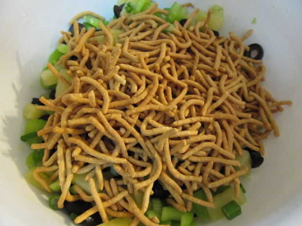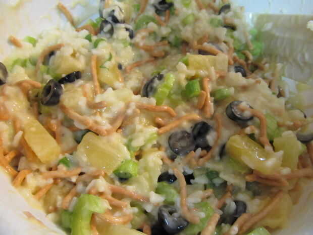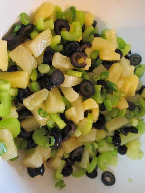2. mientras tanto cortar el apio, cebolla y aceitunas y drenar su piña