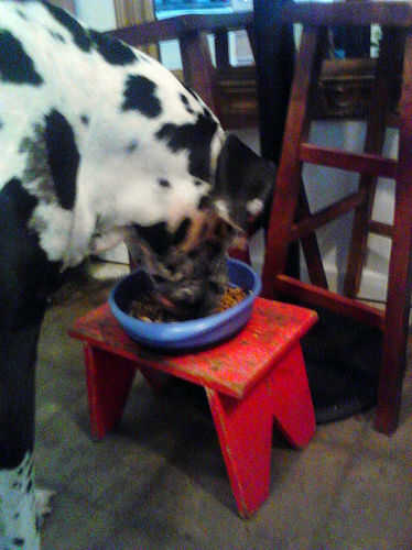 Tienen que para levantar un plato de la tierra para un perro grande.  PERO, aquí, el perrito se siente grande así.
