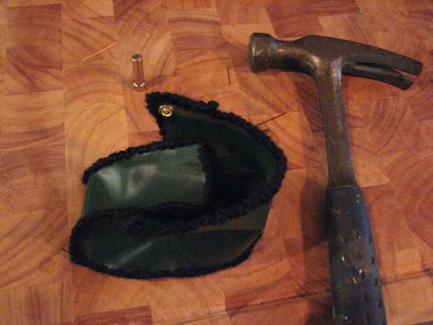 Después de coser la suela entera agregué ojales para cordones. Se trata de un agujero, ajuste de la arandela y un thunk buena con un martillo de perforación. Nota: Los ojales pueden ser un poco melindrosas es mejor probar algunos en chatarra antes de usarlos en una pieza acabada.