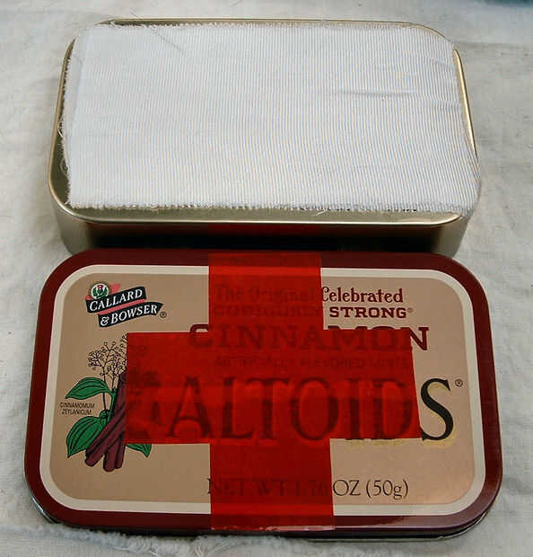 en mi kit de bolsillo med que tomo en todo el mundo, he aprendido más en su lata Altoids caben si pones todos los productos de papel-como en la parte inferior como lo hice. También se utiliza ese gran papel que vino con mi Altoids para envolver alred