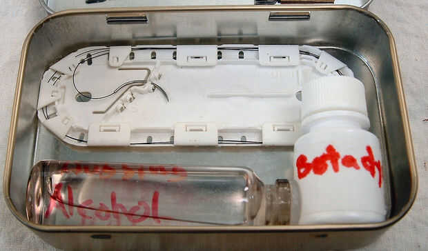Primero añadí las abultadas grandes cosas aquí. Las botellas son debe lo suficientemente pequeño para caber la sutura kit pone agradable y plana en la parte inferior. Asegúrese de esterilizar la sutura antes de usar el Betadine o alcohol.