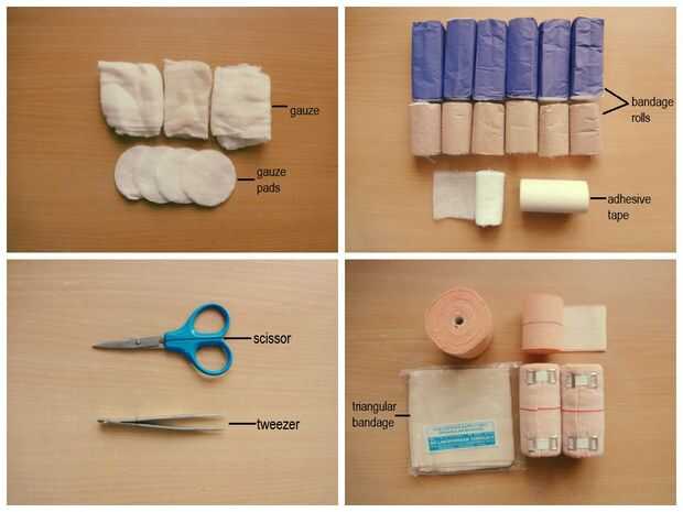 - Gasa - se utiliza para la limpieza de la herida como absorbe los fluidos de la sangre y cuerpo. también se utiliza para cubrir la herida antes de vendar.