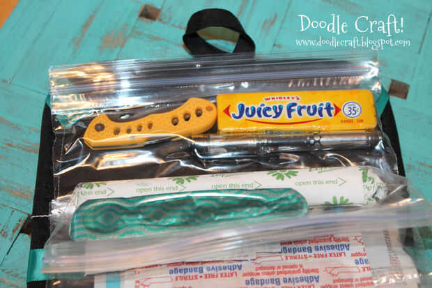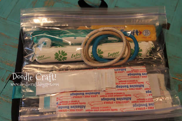 Con lo esencial. La verdadera emergencia cosas! Cuchillo, lápiz, goma, tapón, cepillo de dientes, lazos para el cabello, pasadores de seguridad, vendas, cortaúñas, crema de quemadura, tylenol, antiséptico, vendas mini (cuz son manera más lindo)