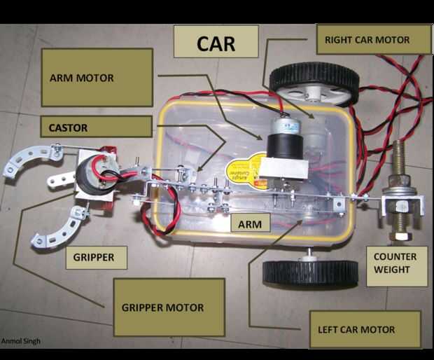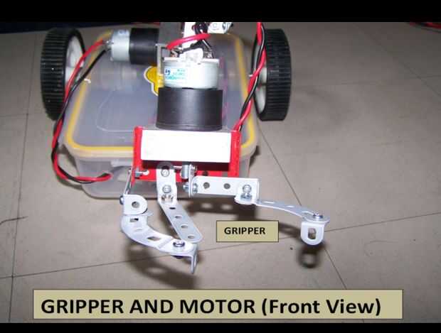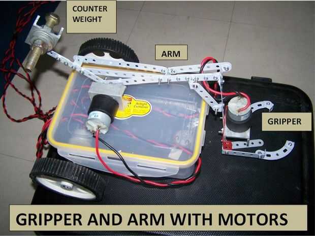 contrarrestar el peso del motor pinza como el motor pesaba ~ 225 gramos. El contrapeso se une en ángulo para permitir el movimiento fácil del brazo. Más miembros de acero fueron agregados en el lado del brazo para fortalecer con el fin de reducir el balanceo lateral del brazo mientras conduce el coche o el brazo. En la pinza, se agregaron miembros de acero semi circulares para permitir la fácil apropiación de la bola / objeto. Un miembro de acero adicional fue agregado en la parte inferior para evitar que la bola caiga. Dos soportes fueron fijados convenientemente a los miembros de acero semicirculares que le empujan la bola dentro de la pinza.