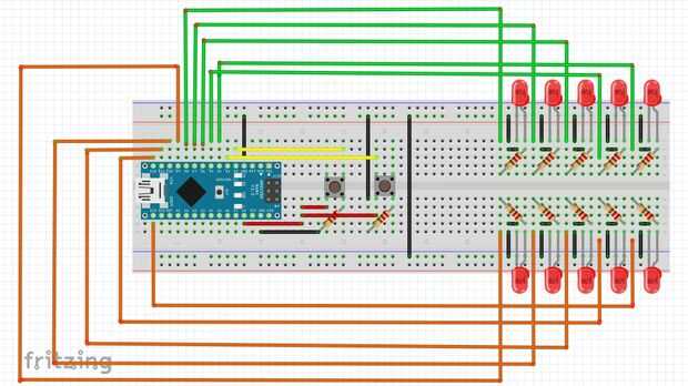 Este es el primer proyecto de Arduino que he creado yo mismo. Yo tenía un montón de LEDS y un sensor de presión, así que pensé que haría un pequeño juego. Cuanto más se apriete el sensor de presión, el enciende para arriba en una fila LEDS más. Si en