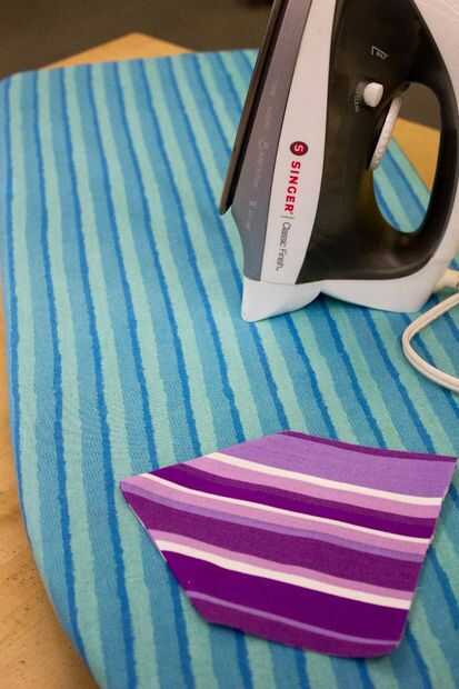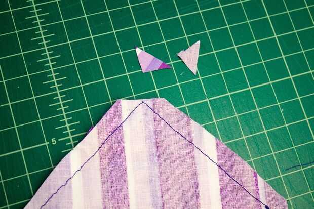 Para ayudar a la esquina, puede cortar cerca de la costura como en la imagen, luego, vuelva y plancha las costuras planas. Girar sus piezas rectangulares derecho hierro a lo largo de la costura del lado largo que acaba de hacer.