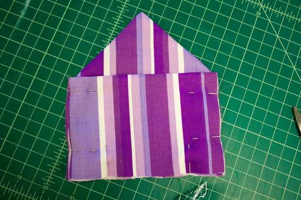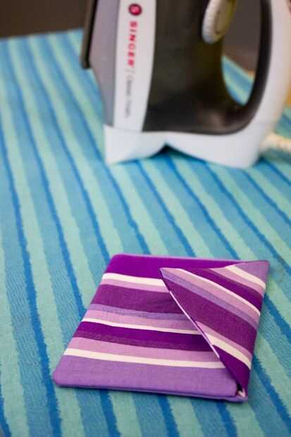 Gire a la bolsa de adentro hacia afuera, las esquinas del corte si se desea y de hierro plano. Plegar la solapa sobre la bolsa y el hierro.
