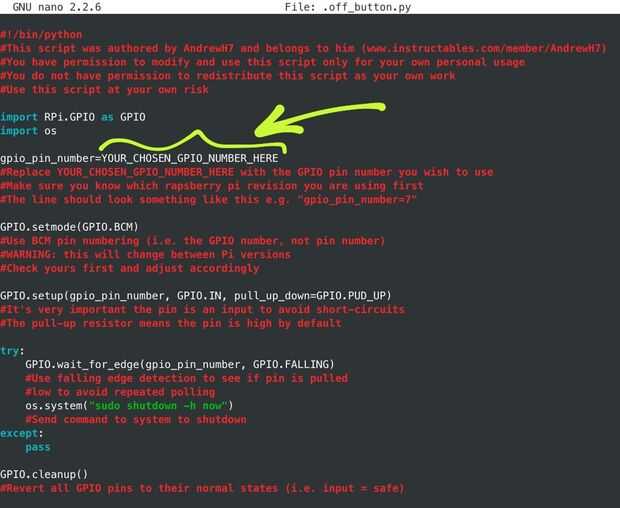 Utilice las teclas de cursor para navegar y vuelva a colocar la variable en la parte superior llamada, "YOUR_CHOSEN_GPIO_NUMBER_HERE" con el número de pin GPIO justo elegiste. En mi caso, con una Junta de revisión 2 frambuesa pi B usé 7.