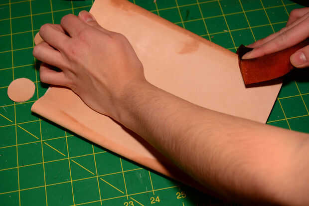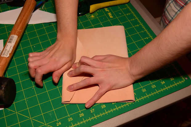 Después de cortar el diseño del cuero, me gustaria empezar a ver realmente la forma de mi caso. Comienzo a Presione los dobleces con mucha fuerza a mano, a menudo yendo sobre ellos con una esponja mojada entonces golpeando con un mazo para presionar la tapa. También puede utilizar una gubia v aquí para ayudar a hacer sus dobleces, no siempre resulta necesaria.