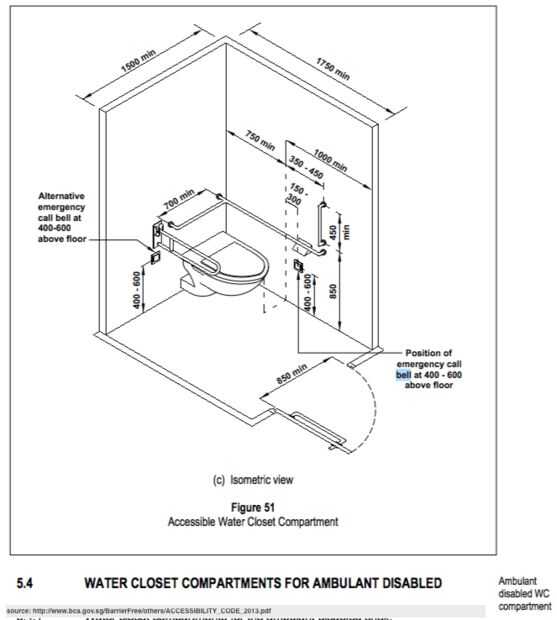 Normativas de construcción (casi universalmente) exigen el cumplimiento de un código de acceso de alguna forma, que a menudo requiere la instalación de una "Emergencia llamar Bell" o semejantemente nombrado dispositivo en aseos y tal para las personas con discapacidad. Por ejemplo, como parte de las "disposiciones sanitarias" para edificios en Singapur, la especificación dice así: