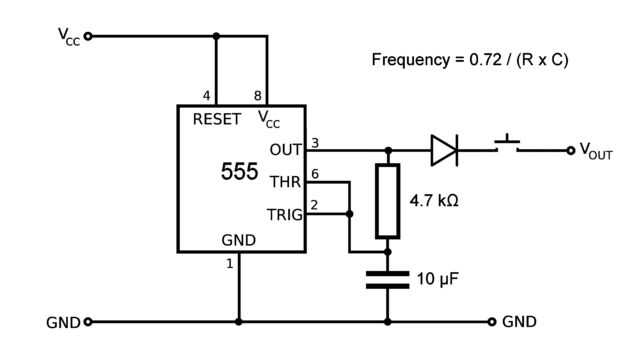 La frecuencia de estos pulsos es determinada por el valor del condensador que es conectado a los pines 1 y 2 y el valor de la resistencia que está conectada a los pines 2 y 3. Usé un condensador de 10 μF y un resistor de 4.7 kohm. Esto produce una frecuencia de unos 15 Hz (sobre 900 pulsos por minuto). Al disminuir el valor de la resistencia y el condensador, aumentará la frecuencia de salida. Al aumentar estos valores, reducirá la frecuencia de salida. Como calcular la frecuencia exacta puede utilizar la siguiente fórmula.