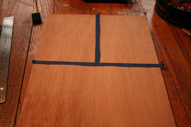 En primer lugar, preparar la madera para la pintura dividiéndolo en 4 secciones rectangulares con un lápiz. Luego, delinear las secciones con unos finos trozos de cinta de pintor.