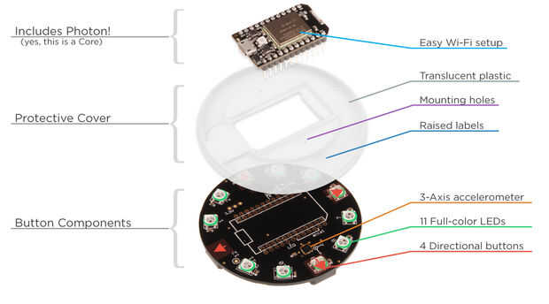 Este es un proyecto simple con ninguna Asamblea. Todo lo que necesitas es un botón de Internet de la partícula. Es un fotón (microcontrolador) con un escudo (botones y LEDs).