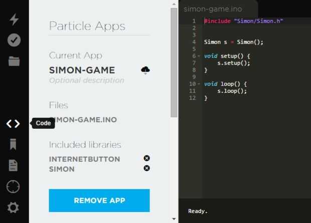 Hice la mayor parte del código disponible como una biblioteca comunitaria, llamada a Simón. Añadir a tu proyecto y también añadir la biblioteca de InternetButton.