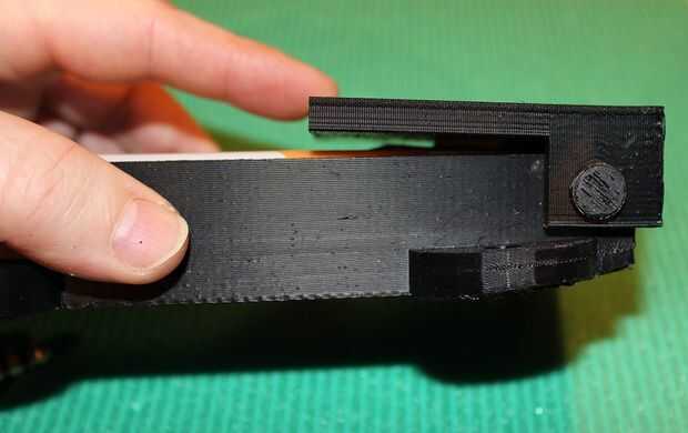 Pernos de bisagra impreso 3D ir a través de orificios laterales de la almohadilla con bisagras superior que presiona, en orificios en el bastidor principal de impresión 3D.
