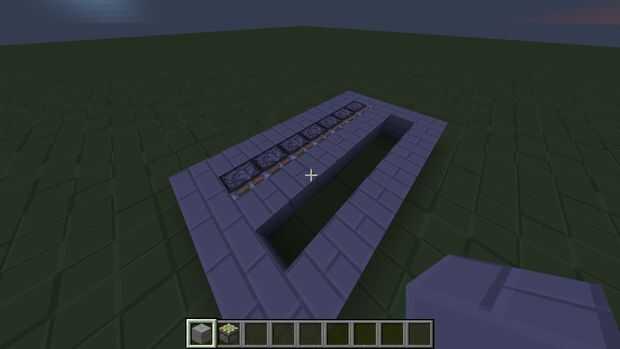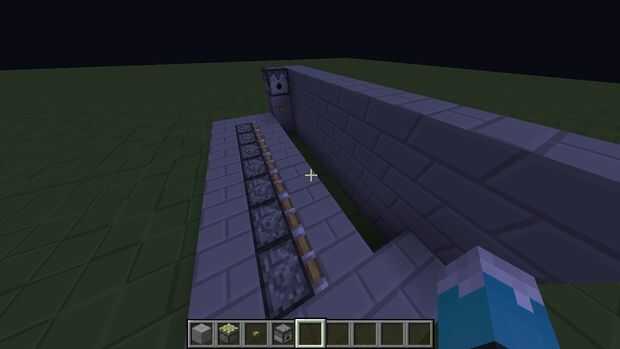 Luego agregue 2 bloques por encima de los bloques a la derecha para empezar a hacer la sala, también colocar un bloque en la parte posterior sobre el bloque detrás del hoyo. A continuación, agregue un botón de madera (no piedra!) en ese bloque y un dispensador de arriba (como en la imagen)