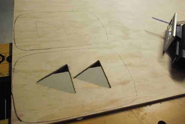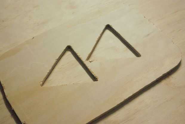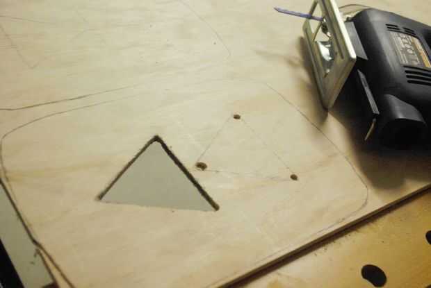 Después de ese trazado, seguir adelante y empezar a recortar el exceso. Consejo rápido - lo mejor es cortar los triángulos de las caras de botón primero antes de corte exterior. Para cortar los triángulos - Haz un taladro inalámbrico el espesor de la hoja de rompecabezas y perfore un agujero en cualquier lugar en el triángulo (no cerca del borde como lo hice!). Entonces sólo ranura su cuchilla rompecabezas en el agujero que perforado y corte hasta obtener 4 triángulos cortados.