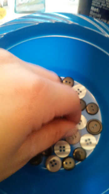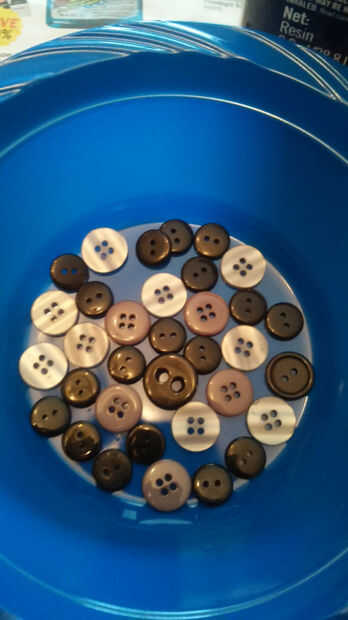 Empecé colocando cuidadosamente mis botones en mi molde. En este caso era un recipiente de plástico.