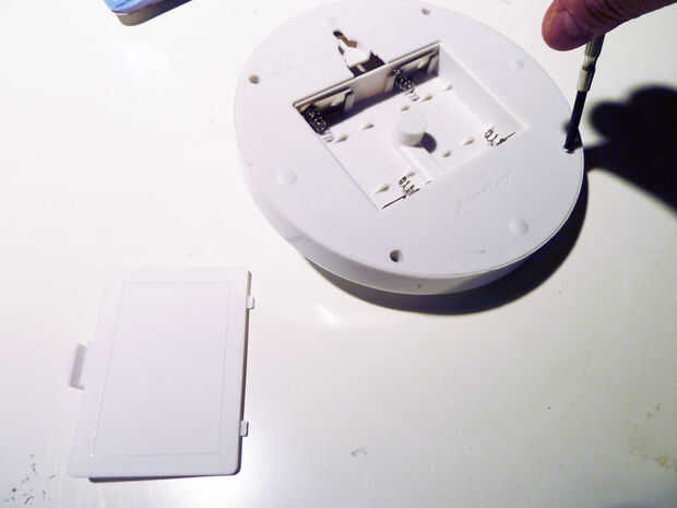 Quite la tapa y aflojar los 4 tornillos de la parte posterior de la luz. La espalda se desprenderá fácilmente una vez desatornillada. Usted puede llevarlo a cabo por aferrarse a los orificios en el soporte de la batería.