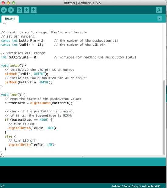 Para este proyecto, utilizar el ejemplo de la IDE de Arduino en la carpeta de ejemplos >> Digital >> botón.